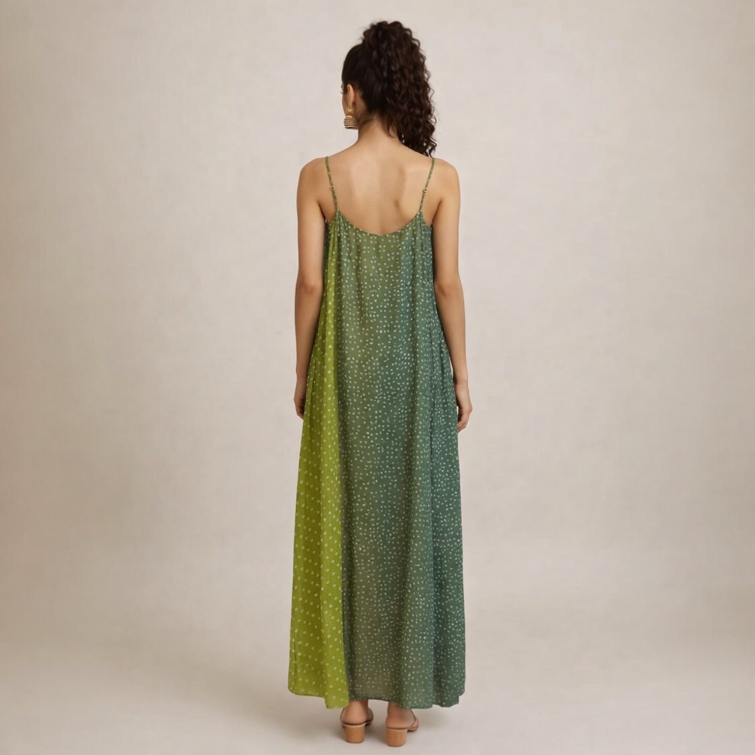 The Amber Silk Slip Dress embodies effortless elegance and fluid movement. Crafted from smooth silk, this floor-length silhouette features delicate spaghetti straps and a softly draped neckline that enhances its graceful, relaxed shape. The design is enriched with subtle all-over motifs and gentle color transitions in earthy green and amber tones, creating a refined yet contemporary aesthetic.