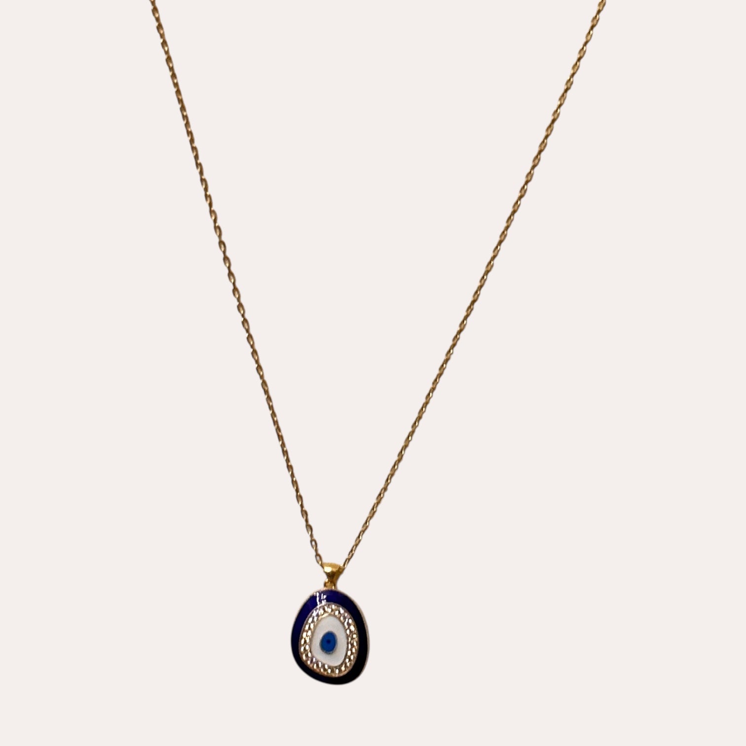 A gold-toned necklace featuring a deep blue evil eye pendant accented with shimmering details. A modern protective talisman designed to bring calm energy and effortless style to your everyday look.