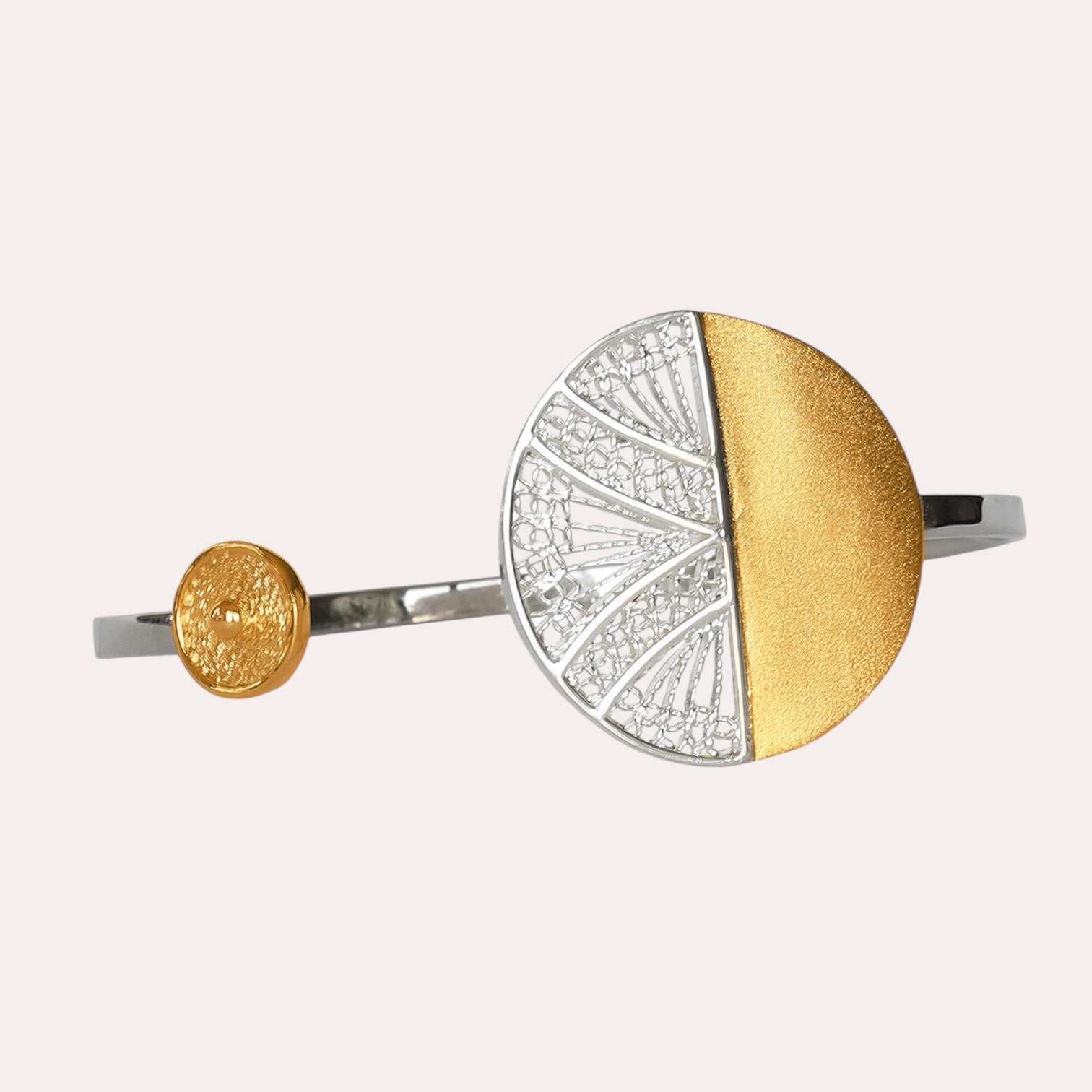 A stunning fusion of texture and artistry, this open bangle is crafted in 925 sterling silver and enhanced with a luxurious 18k gold plating. The half-matte, half-filigree sunburst design creates a unique statement that is both modern and timeless.