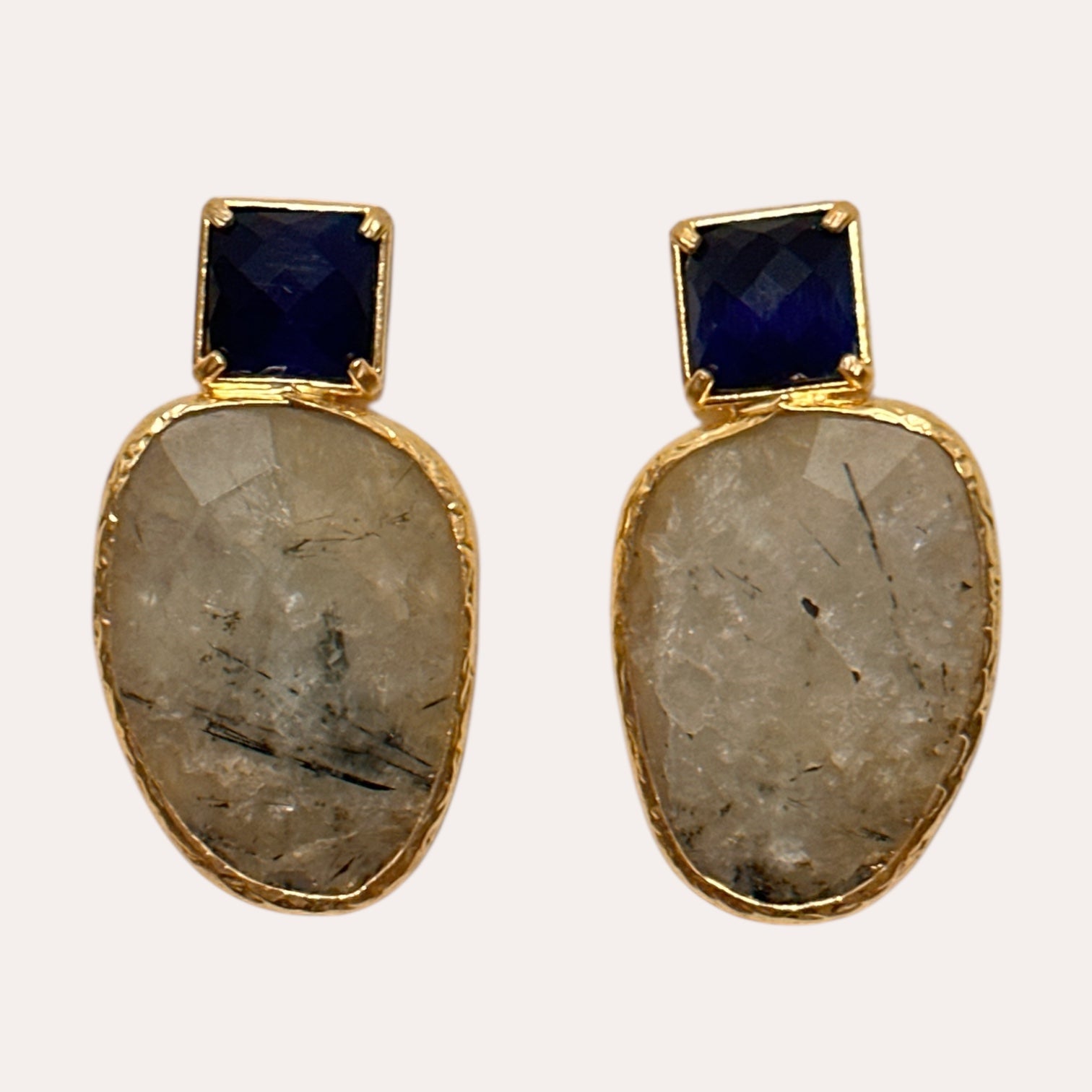 Gold-plated dangle earrings with faceted navy crystal stones and marbled grey drops. Lightweight, bold, and designed for effortless statement style.