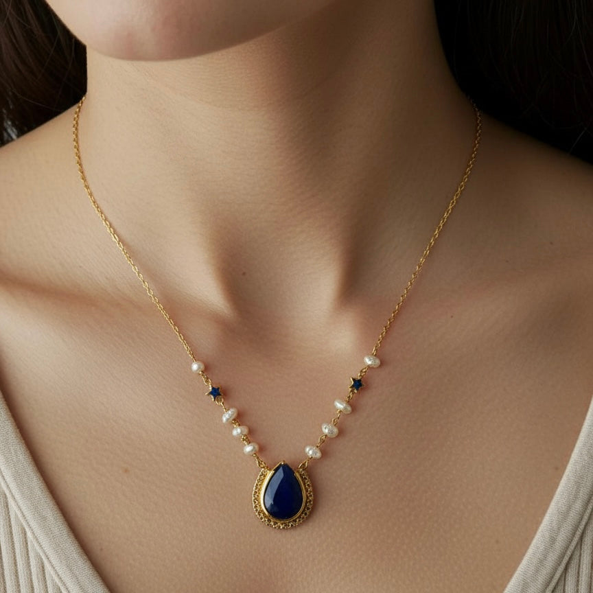 The Midnight Pearl necklace captures quiet luxury with a celestial touch. A deep sapphire-blue teardrop pendant is framed in warm gold and anchored by delicate freshwater pearls along a fine gold chain. Subtle star accents add a hint of night-sky magic, creating a graceful balance between classic elegance and modern charm. Designed to rest perfectly at the collarbone, this necklace is a timeless statement—effortless, luminous, and endlessly refined.