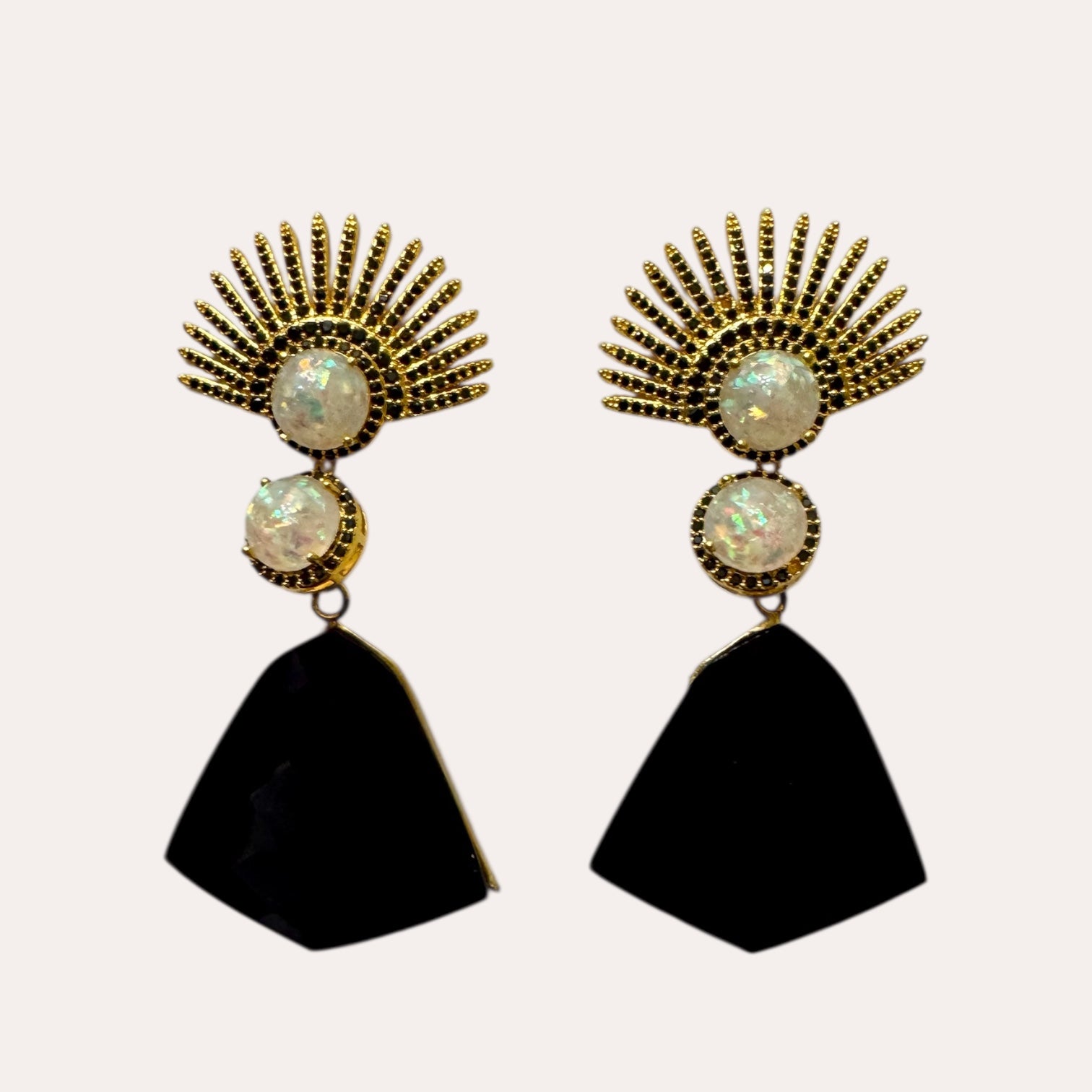 These striking gold-plated statement earrings are inspired by radiant sunbursts and modern elegance. A textured, fan-shaped gold-plated top surrounds a luminous opalescent center, followed by a second glowing accent that adds depth and dimension. The design is finished with a bold navy blue geometric drop, creating a refined contrast against the warm gold tones. Sophisticated and artistic, the Pyramid Navy Gold-Plated Statement Earrings are perfect for evening events, formal occasions, and elevated contemporary styling.