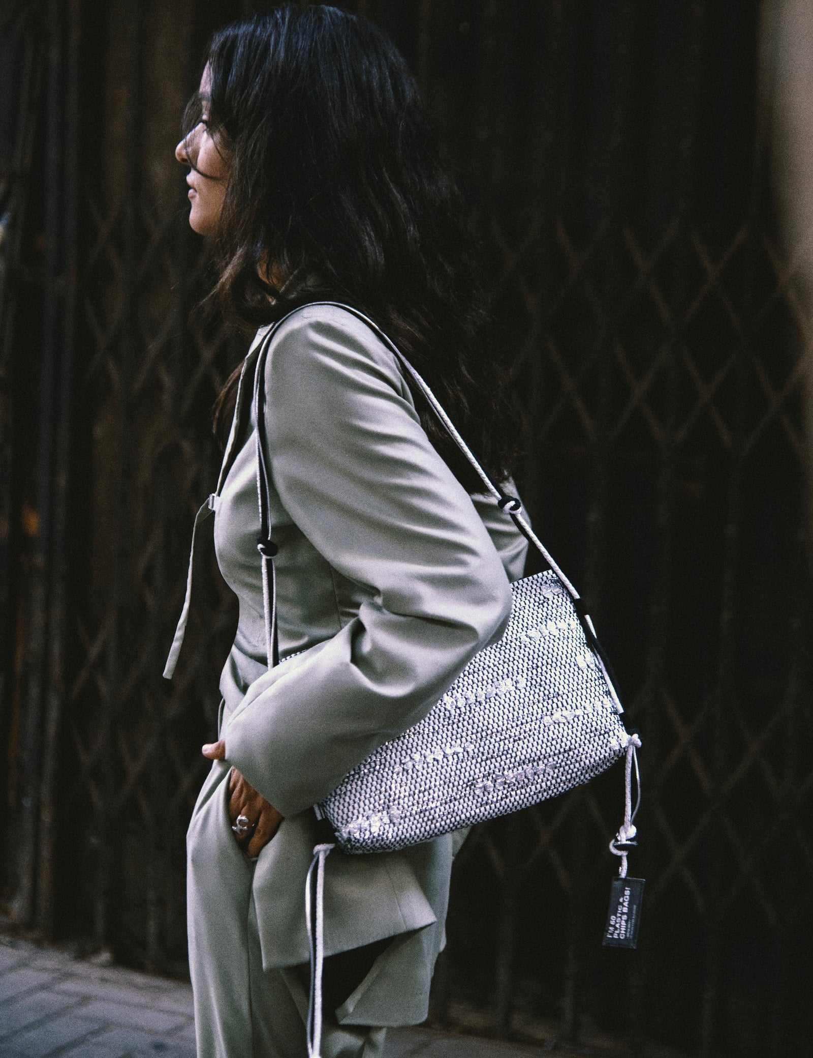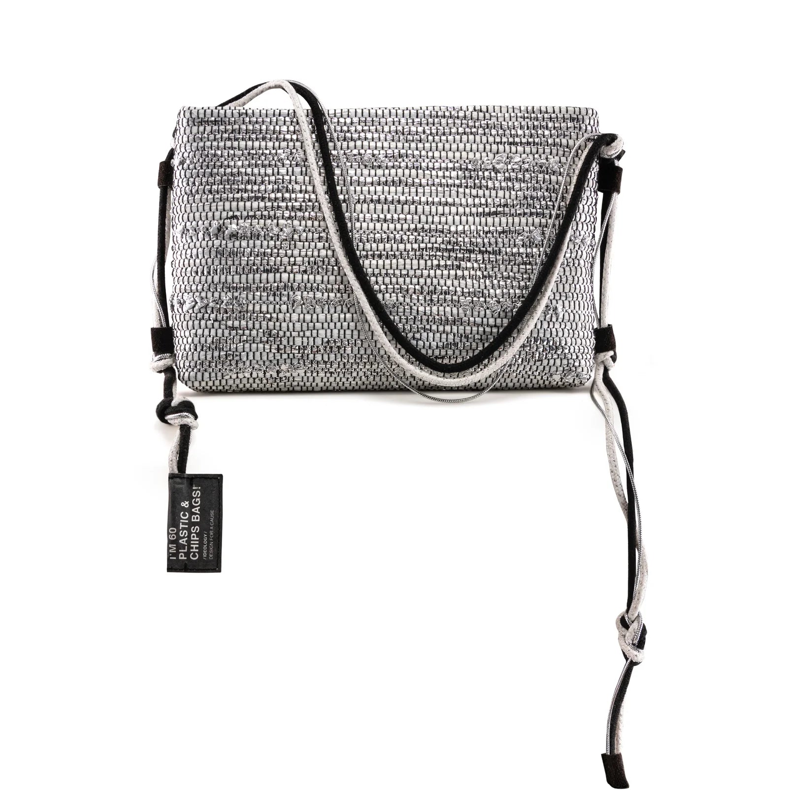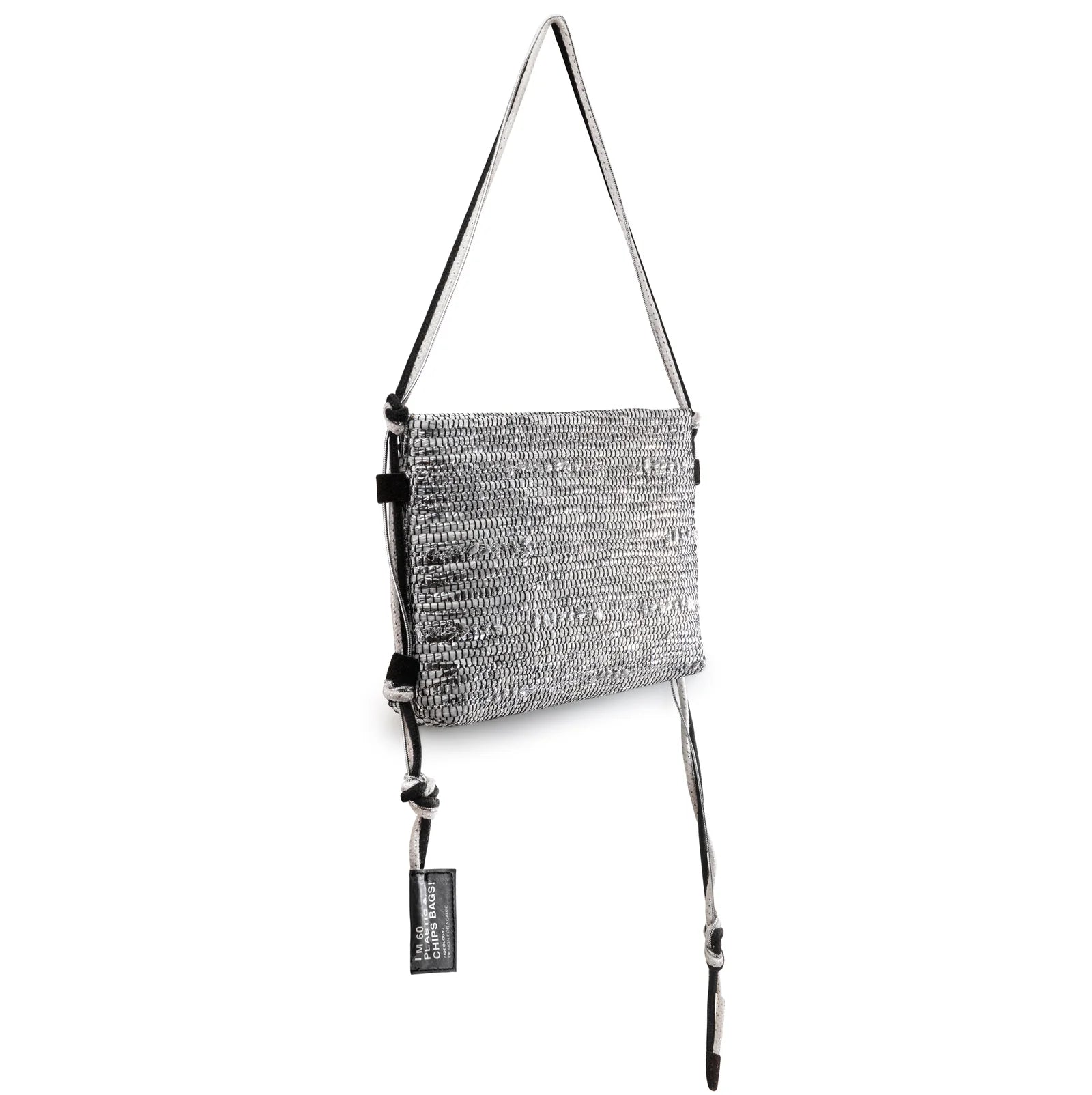 The Sarab Selection evokes the fleeting, illusionary beauty of a mirage at sunset. This metallic bag, designed with silver and white undertones, reflects the subtle shimmer of dusk’s final light. It merges contemporary style with the timeless artistry of traditional Egyptian craftsmanship. Handcrafted from our own fabric, the infamous eco-friendly Plastex, this luxurious bag is made from a combination of plastic bags and food packaging waste (chips bags).