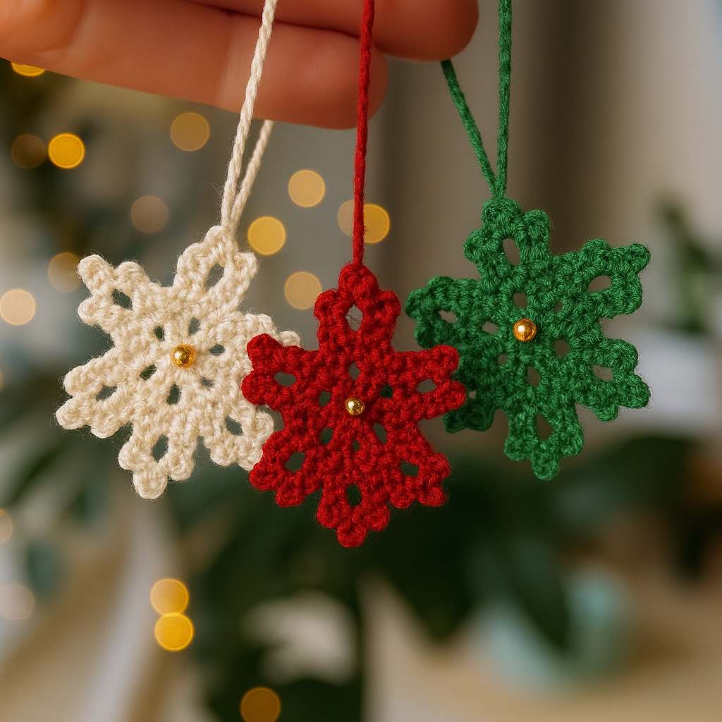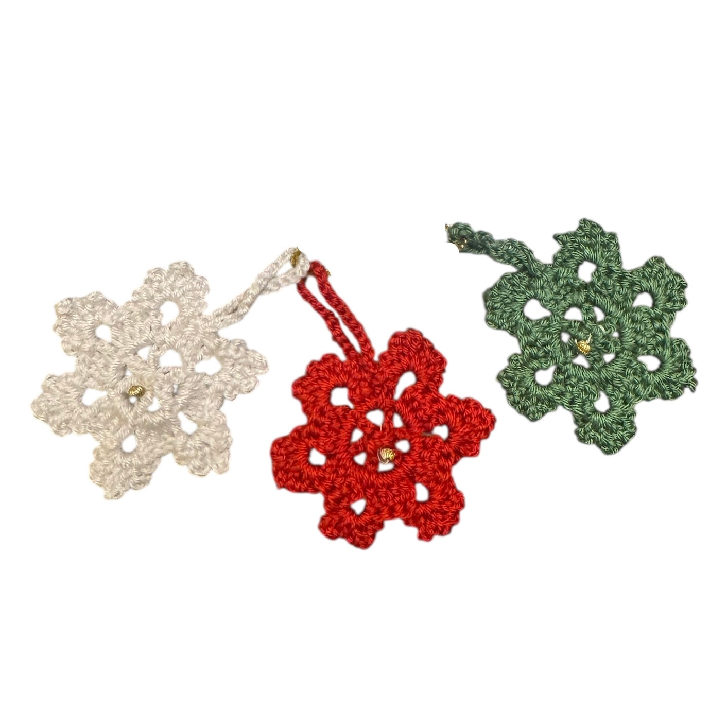 Illuminate your holiday décor with our Handmade Crochet Star Trio — a delightful set of three stars crafted in classic festive colors: cream, red, and green. Each star is beautifully detailed with delicate stitching and finished with a gold bead at the center, adding the perfect touch of sparkle. Lightweight and charming, these ornaments bring a warm, handcrafted elegance to your Christmas tree, wreaths, garlands, or gift wrapping. Full of cozy holiday spirit, they make a lovely keepsake set or a heartfelt seasonal gift.