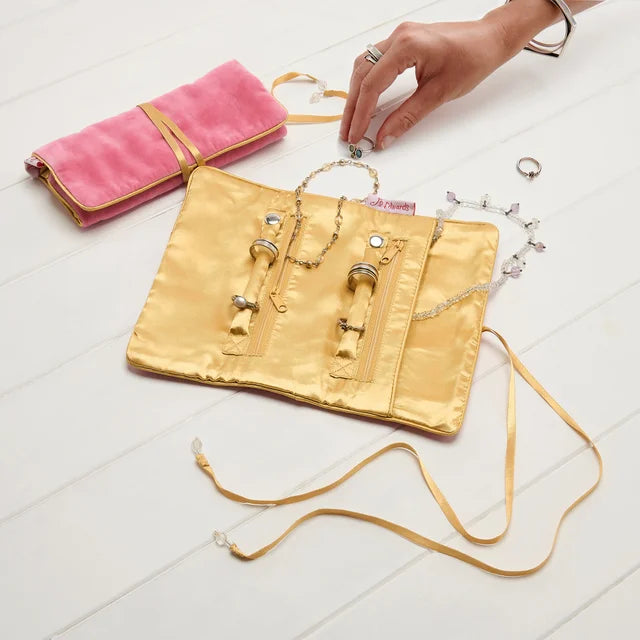 Available in a range of soft, pastel and jewel-tone colors, each roll is secured with a coordinating ribbon tie that keeps everything neatly in place while adding a touch of charm. Inside, the flexible layout comfortably holds rings, necklaces, bracelets, and earrings, making it easy to see and access your collection on the go.