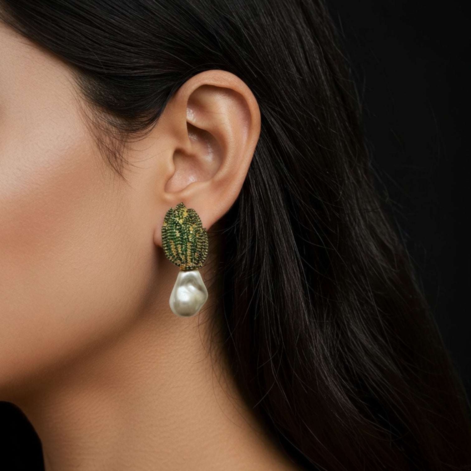 Inspired by nature’s quiet elegance, the Verdant Dewdrop Pearl Earring pairs a textured, leaf-shaped stud in rich forest green with a luminous baroque pearl drop. The organic contours and soft sheen evoke morning dew resting on foliage, creating a refined yet earthy statement. Perfect for elevating both everyday looks and evening ensembles, this earring blends botanical charm with timeless sophistication.