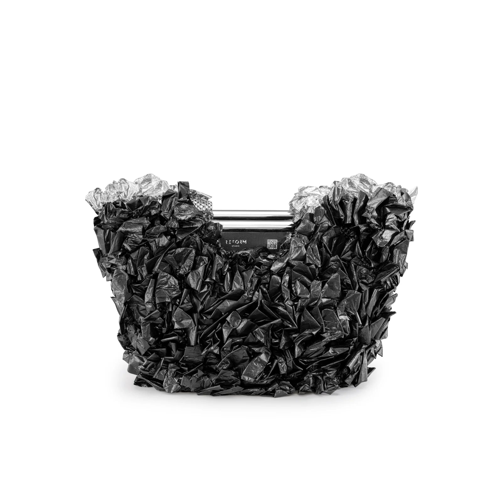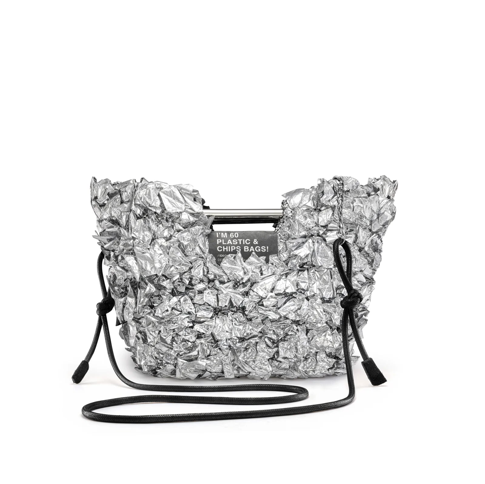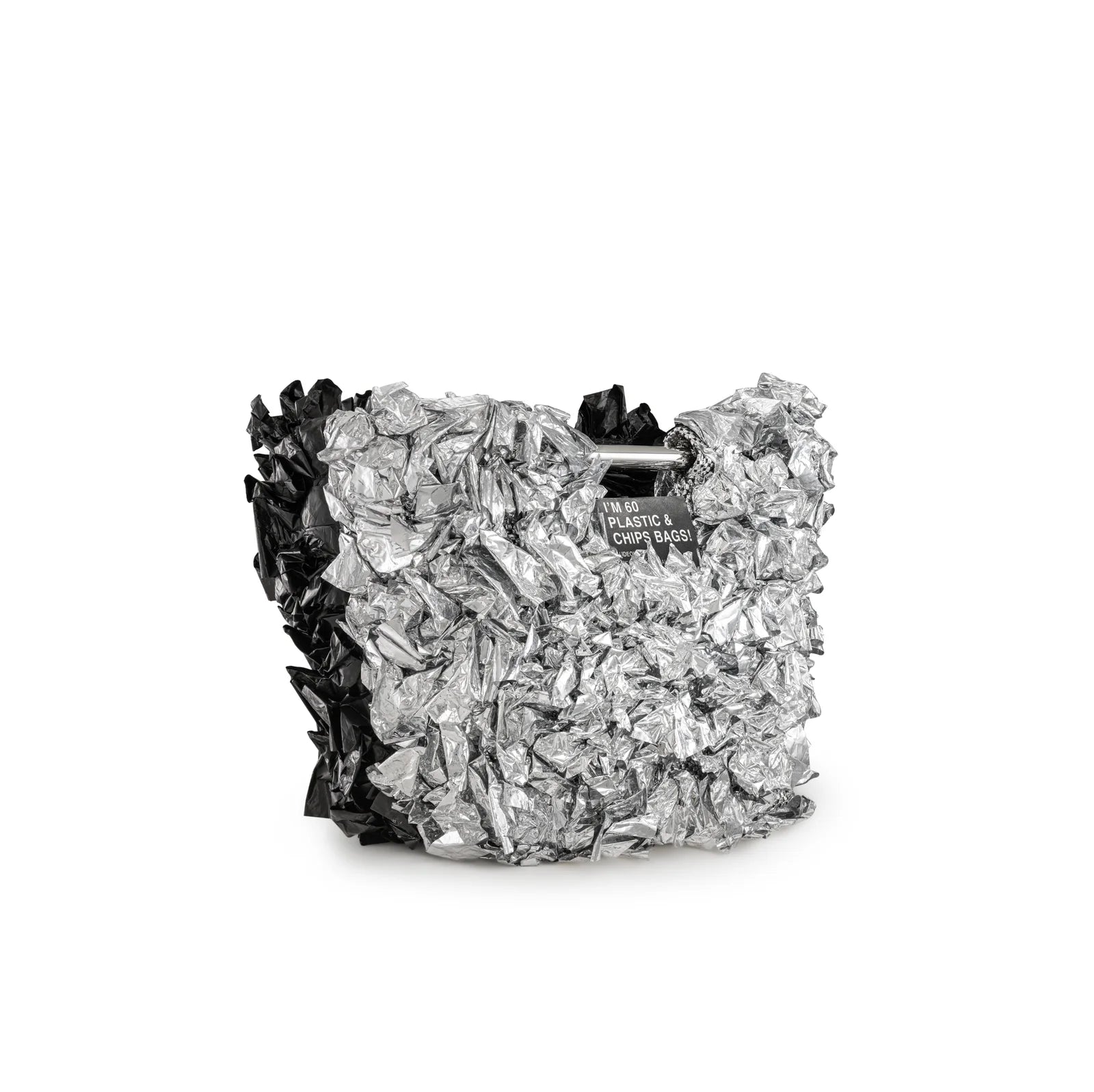The Wahj Selection radiates boldness with its vibrant, high-shine finishes in dazzling silver and black. This bag reflects the fierce, brilliant energy reminiscent of the sun’s final rays before it dips below the horizon. This luxurious selection reflects the sustainable ethos and lavish nature of the Ghoroub Collection. Handcrafted from our own fabric, the infamous eco-friendly Plastex, this luxurious bag is made food packaging waste (chips bags).